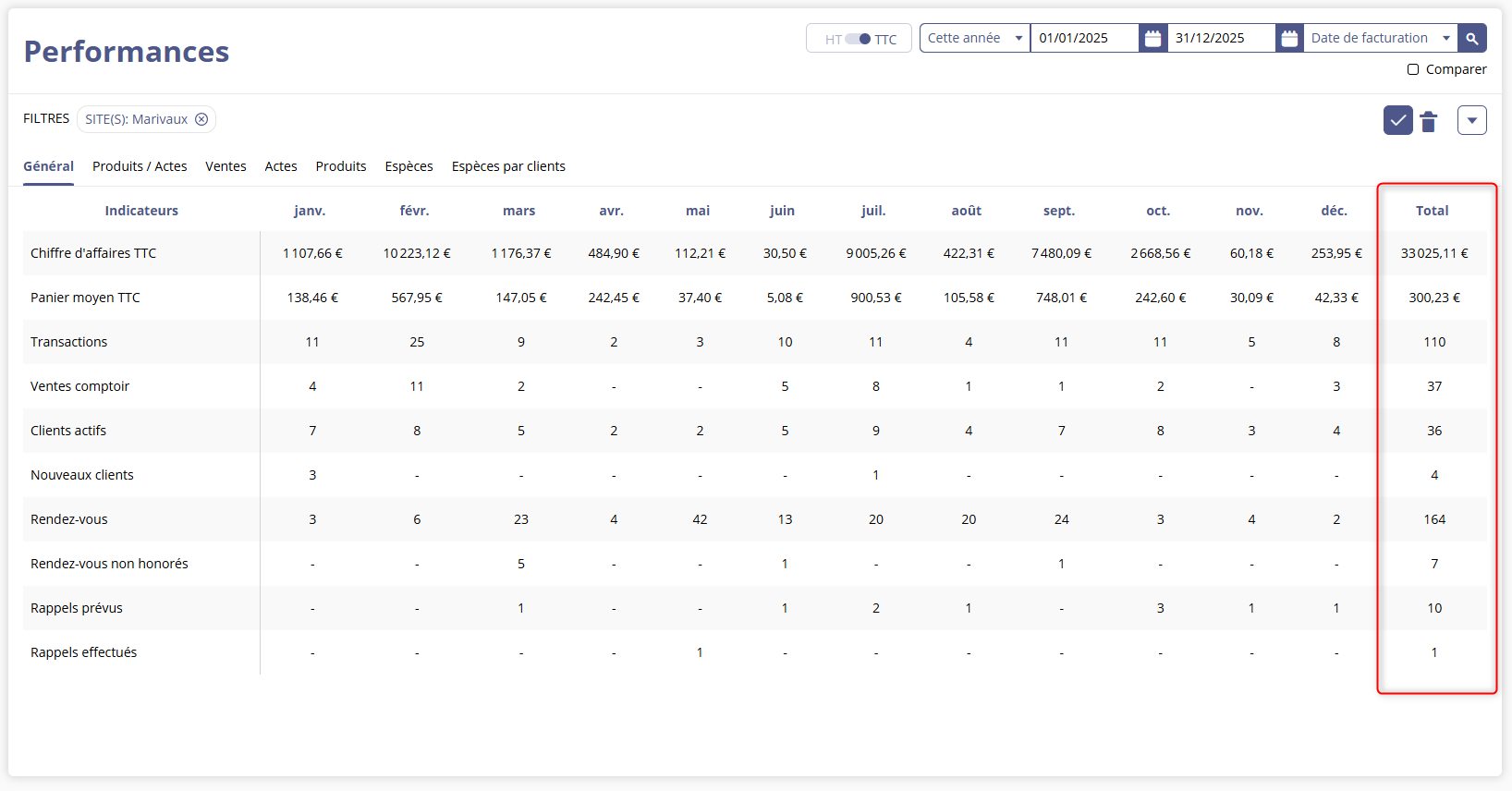 STATISTIQUESUne colonne “Total” fait son apparition dans le tableau “Performances”.