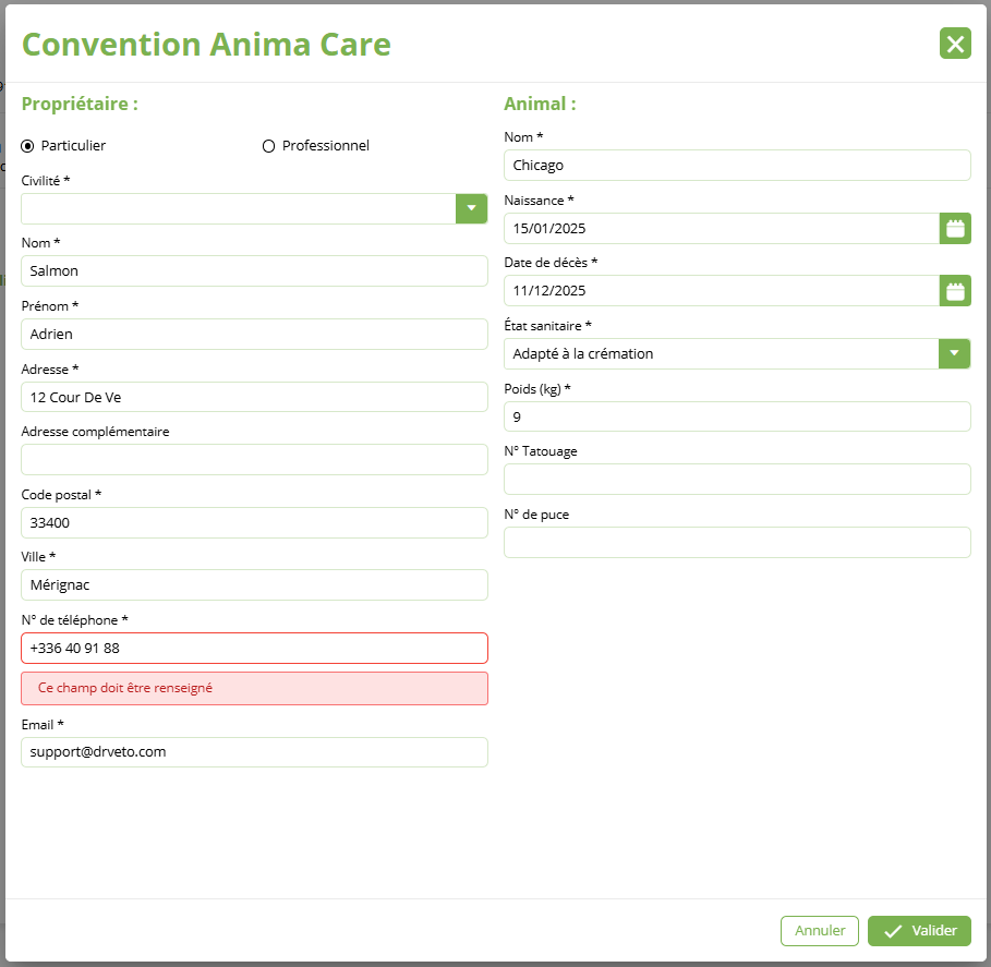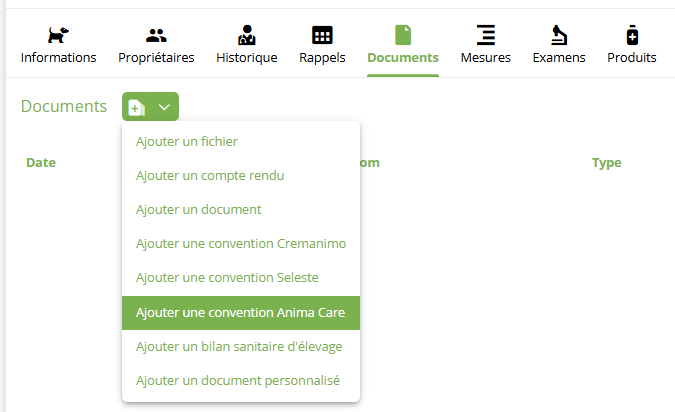 Après avoir activé le partenaire dans les paramètres / partenaires onglet incinération, le lien « convention Anima Care » est disponible sous la fiche animale.