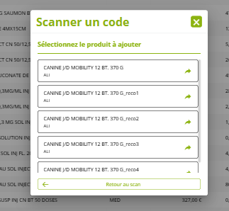Si plusieurs produits correspondent au code scanné, dr.veto vous demande de sélectionner celui que vous souhaitez ajouter à la consultation.