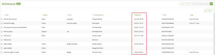 CLIENTSUne colonne « Téléphone » est désormais ajoutée à la liste de vos animaux ainsi qu’à l’export correspondant.