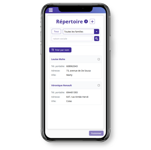 Comme pour le module « Clients », le module « Répertoire » sur smartphone adopte désormais l’affichage en cartes pour présenter l’ensemble de vos contacts.